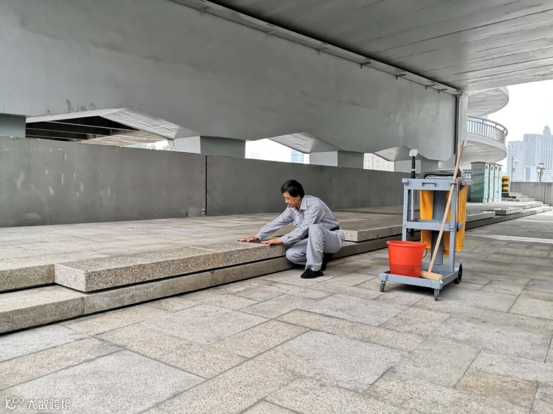 ▲图为保洁员正对地面开展养护工作。