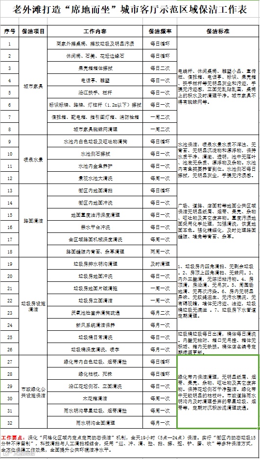 ▲图为老外滩管理部“席地而坐”示范区域保洁工作表,共梳理了32条工作细则、7大作业标准。