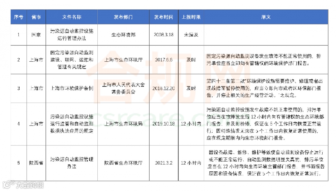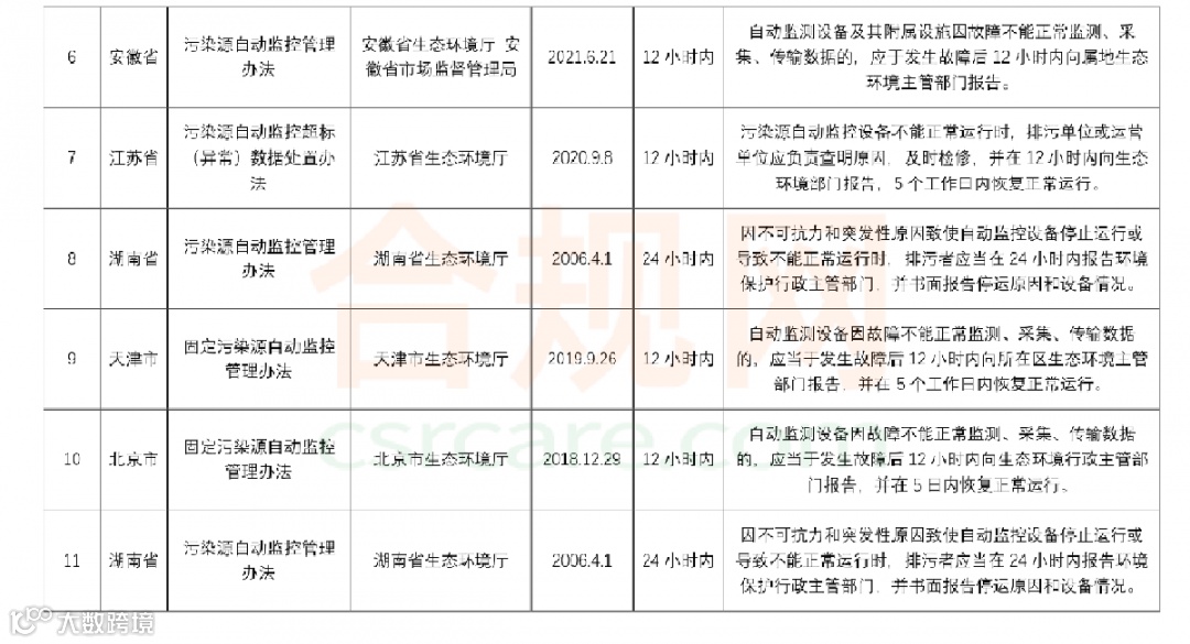 通过以上总结发现,生态环境部发布的《污染源自动监控设施运行管理办法》中对在线监测设备故障上报时间未做明确要求,但值得注意的是如被环境保护管理部门发现故障而企业未上报,将会按照《环境保护法》、《水污染防治法》、《大气污染防治法》《“两高司法”解释》等相关法规受到相应处罚;上海、陕西、安徽、江苏、天津市、北京市要求在12小时内及时上报环保主管部门,湖南要求在24小时内上报,如未在规定时间内上报,将会按照《环境保护法》、《水污染防治法》、《大气污染防治法》《“两高司法”解释》等相关地方法规受到相应处罚;