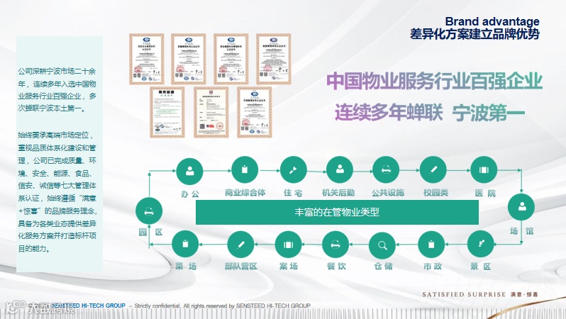 银亿物业坚持主营为主兼顾多元的发展定位,充分利用自身的资源优势,拓展服务领域,开展适度的多元化发展。目前,银亿物业的服务业态现已涵盖16大类型:办公、商业综合体、住宅、机关后勤、公共设施、学校、医院、场馆、景区、市政等等。