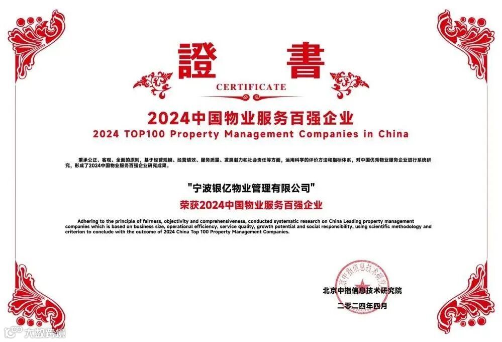 大会表彰物业服务优秀企业,银亿物业以优秀的服务品质荣膺“2024年中国物业服务百强企业”第19名。