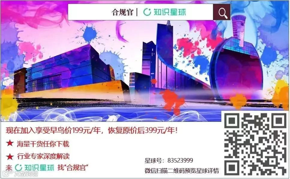 更多合规体系文件已经上传至“合规官”知识星球,感兴趣的朋友微信扫描下方图片中的二维码,下载“知识星球”APP,加入“合规官”。