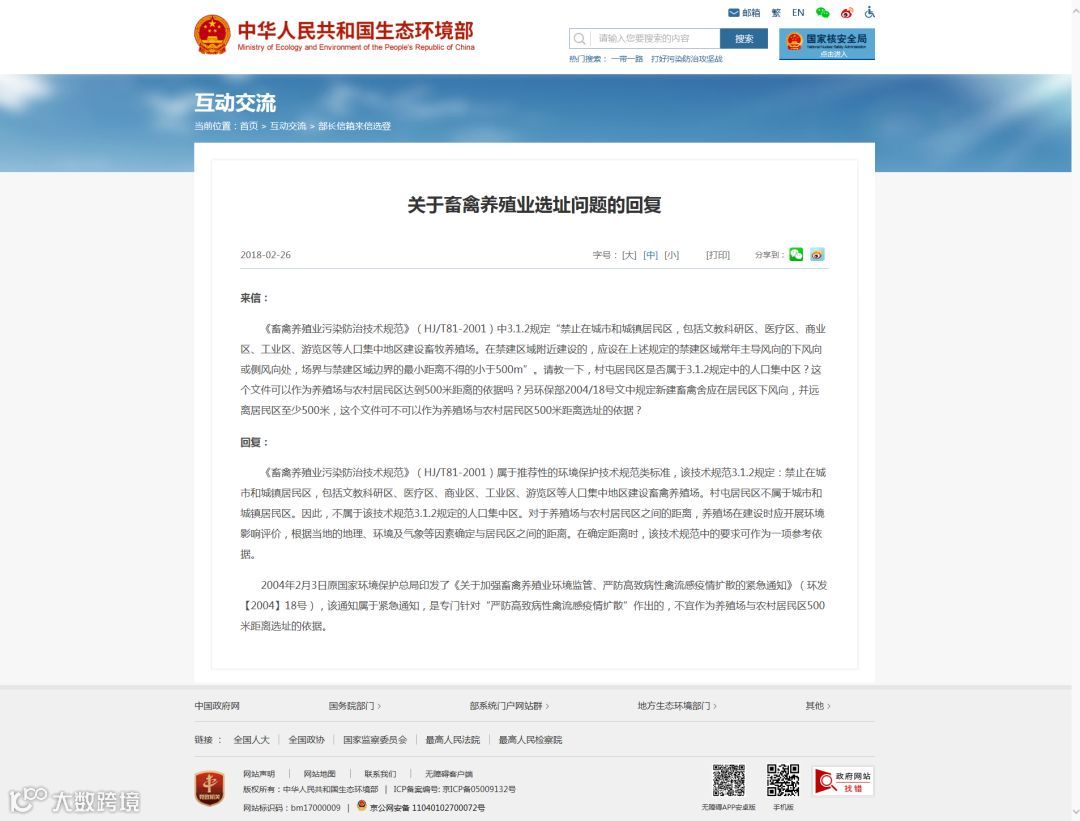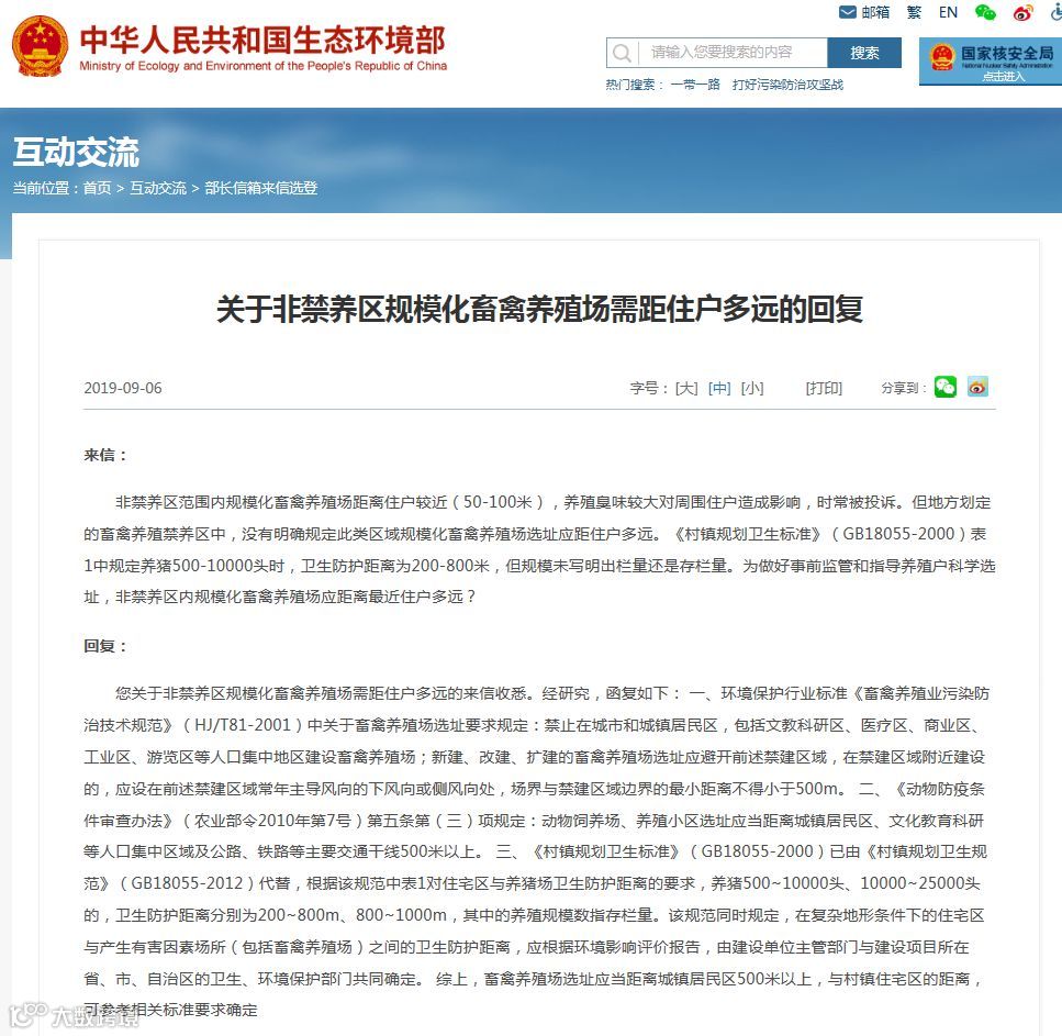 生态环境部关于畜禽养殖业选址问题的回复