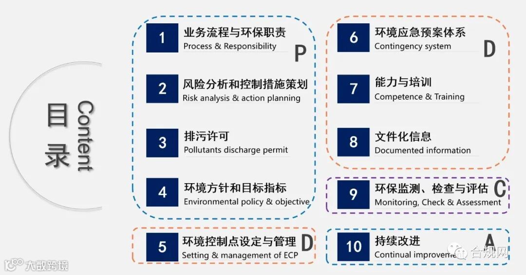 环保手册的框架遵循PDCA理念进行设计,包括4个板块10个部分,其中P的板块包含第1-4部分,D的板块包含第5-8部分,C的板块包含第9部分,A的板块包含第10部分。