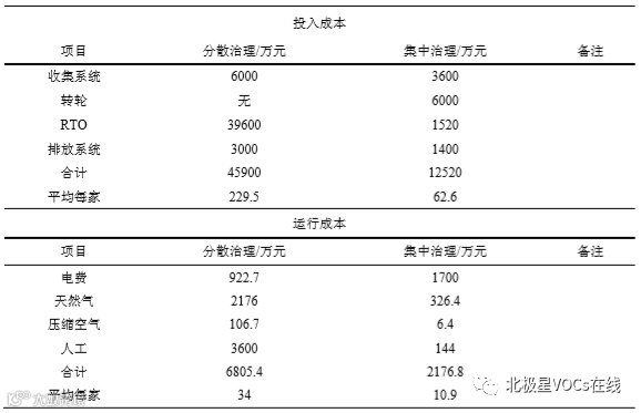 通过投入成本分析,分散治理由于需要每家企业单独上一套 RTO 设备,所以投入资金明显远大于集中治理。分散治理的收集系统和排放系统投入也明显大于集中治理。尽管集中治理转轮部分增加了部分投入,但总的投入也几乎只有分散治理的四分之一。
