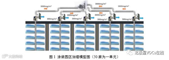 据此成功实例的基础上,结合约有 200 家中小涂装生产企业的工业园区,依据各个企业分布、风量和 VOCs 浓度,设计了“一园一策”的工业园区整体治理解决方案——废气集中 处置及资源化利用中心。