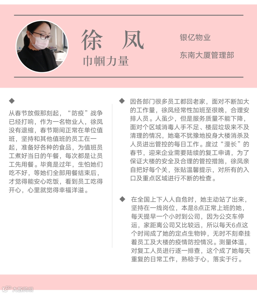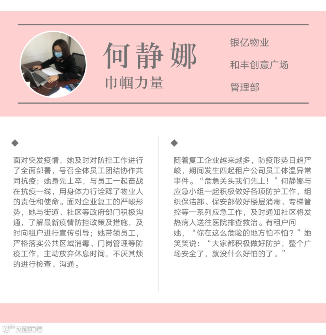 近日,宁波银亿物业管理有限公司众创空间物业服务中心被宁波市总工会授予2018年至2019年度“五一巾帼标兵岗”称号,是宁波市物业行业中唯一的获奖单位。该殊荣充分体现出宁波市总工会对银亿物业公司高品质物业服务的认可,进一步激励我们建功新时代、展示新作为、彰显新风采。