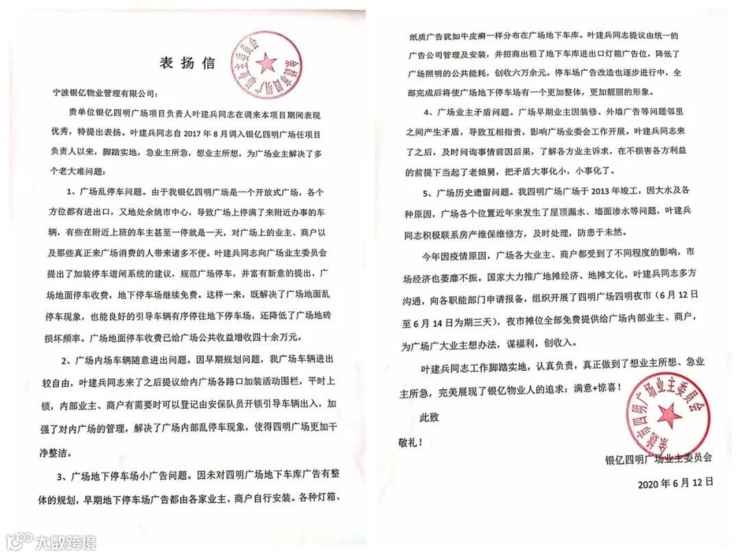△四明广场业主委员会表彰银亿物业管理部负责人叶建兵的感谢信