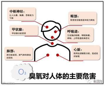 具体来讲,臭氧对呼吸系统具有一定的破坏性,能引起胸闷咳嗽、咽喉肿痛等症状,此外还会影响中枢神经系统、肺功能和甲状腺功能。