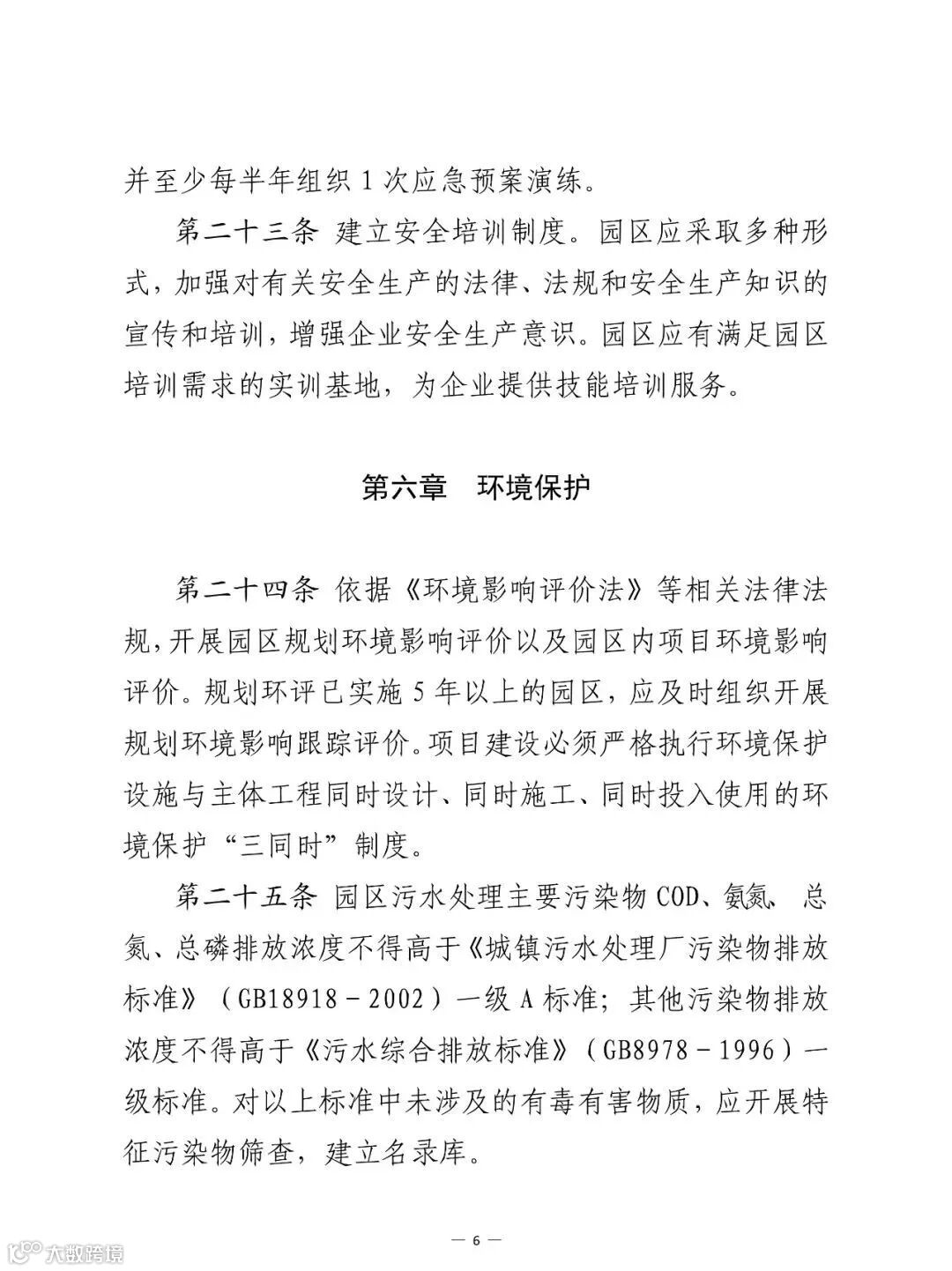 第六部分,环境保护。从园区污水处理、大气污染物排放、土壤污染防治、危险废物处置、突发环境事件应急演练等方面提出了具体要求。