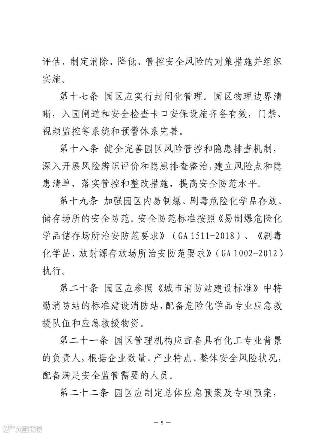 第五部分,安全生产。健全完善园区风险管控和隐患排查机制,分别从开展整体性安全风险评估、封闭化管理、危险化学品存储、消防设施建设、管理机构配备、应急预案演练、安全培训等方面提出了工作要求,确保园区安全生产措施落到实处、见到实效。