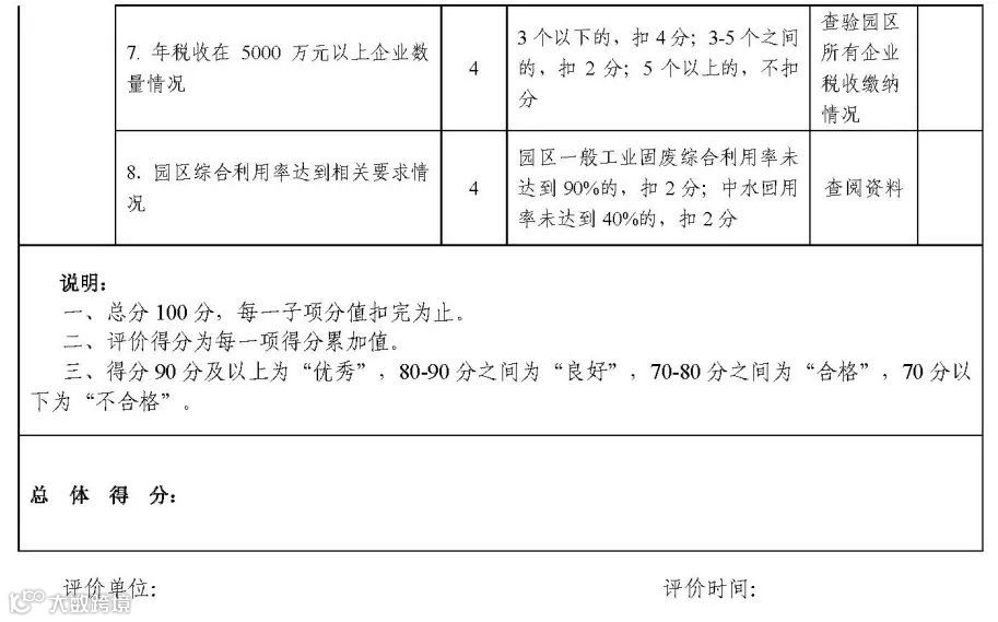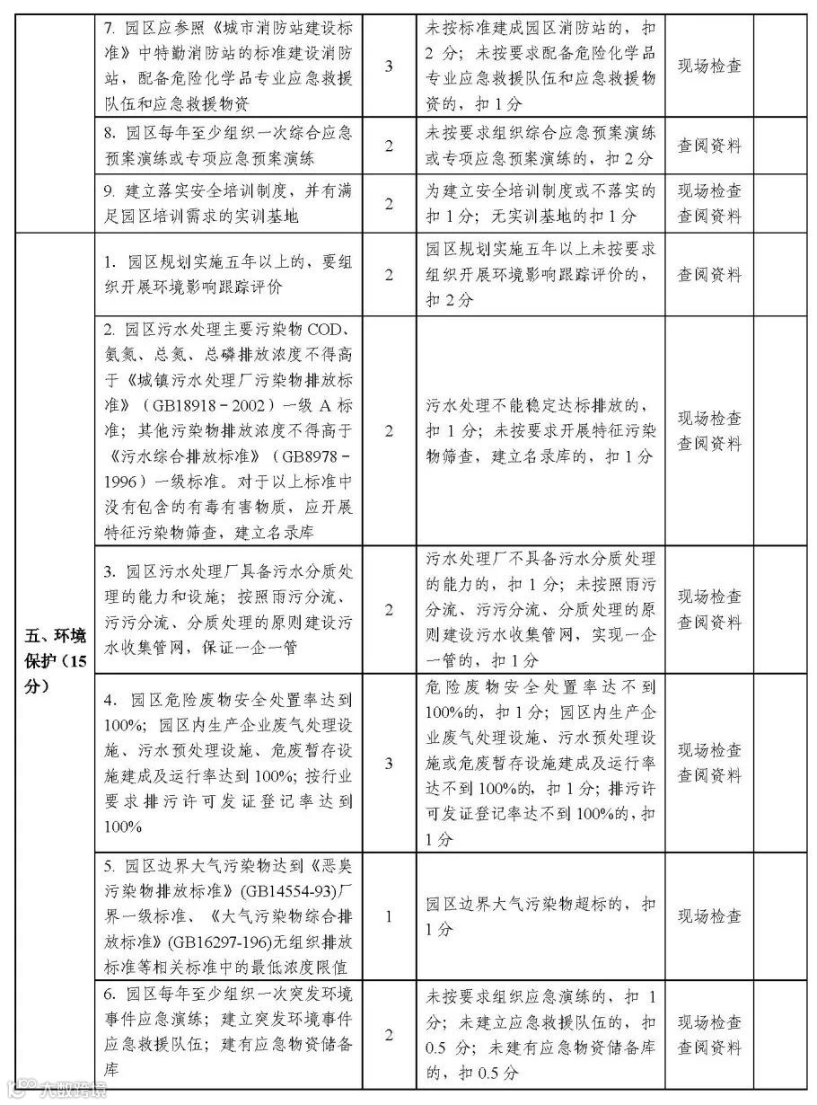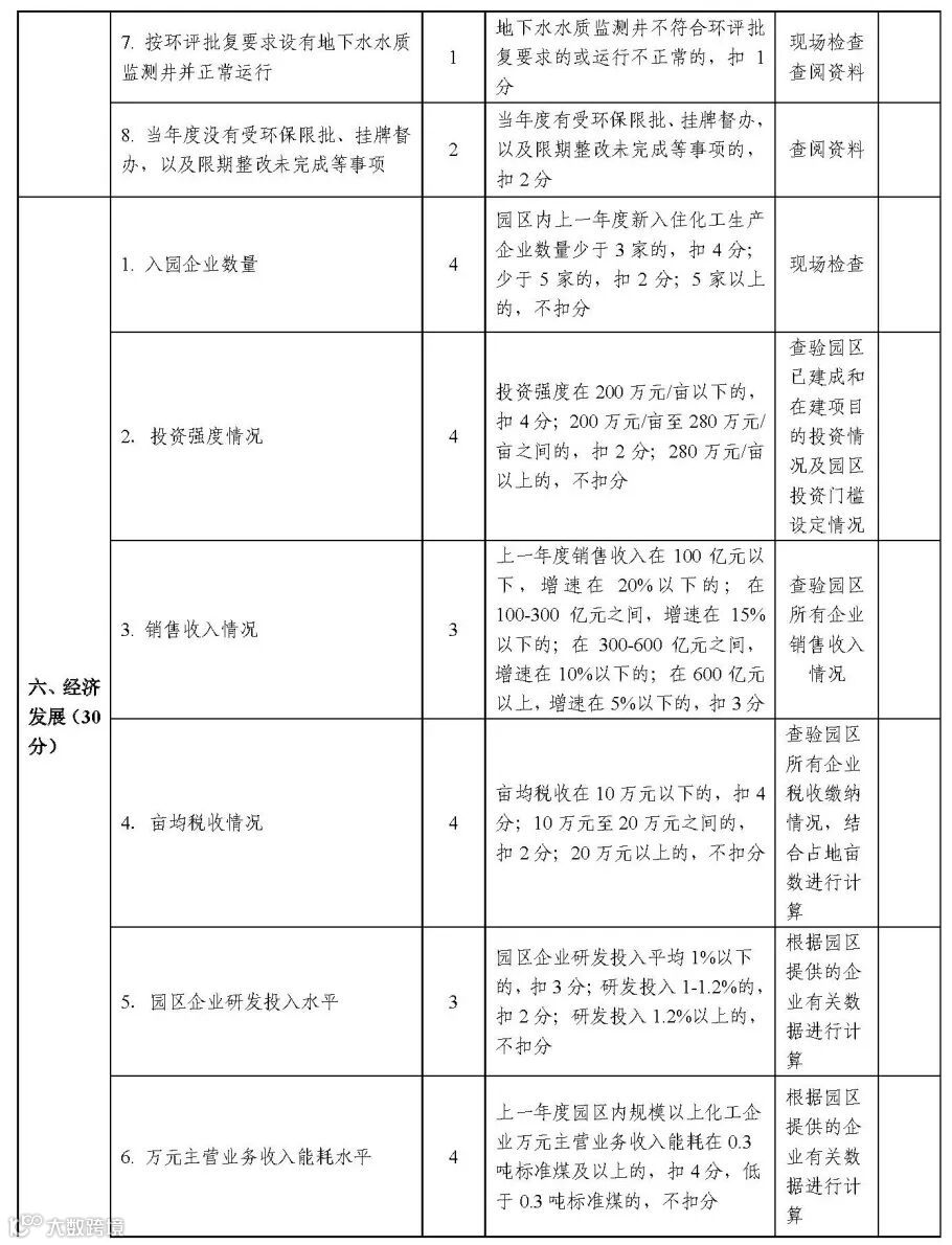 第七部分,管理监督。加强对园区运行情况的考核,实施动态管理,明确化工园区每三年考核一次,专业化工园区每两年考核一次。对考核不合格的给予警告,限期整改;对在规定时限内整改仍不合格的,取消园区资格。