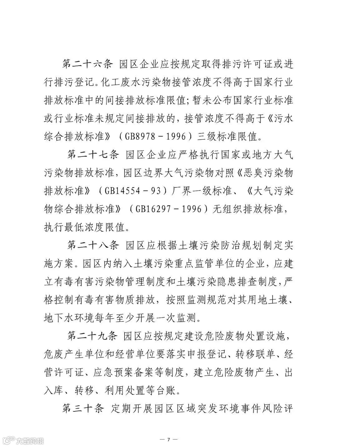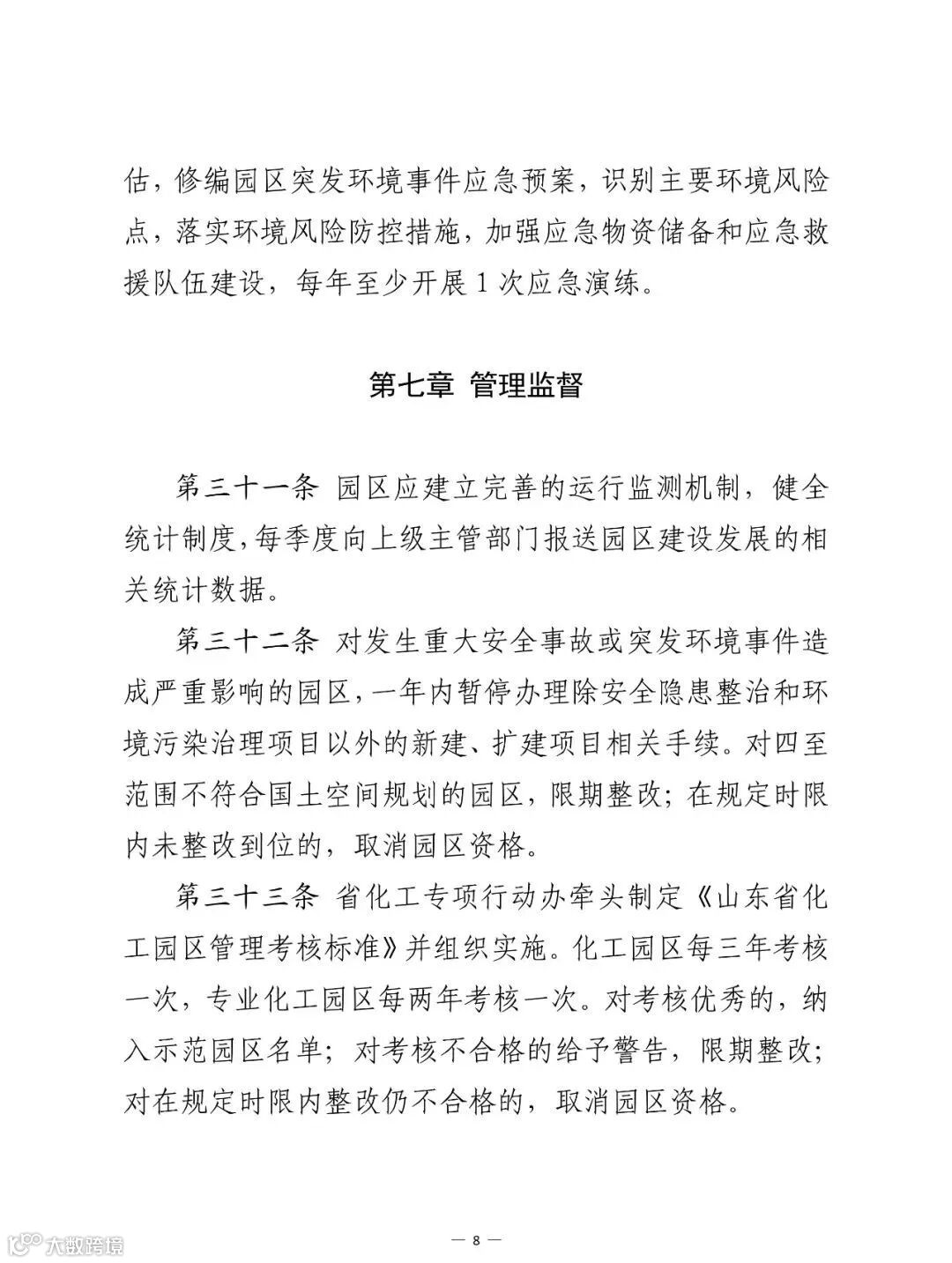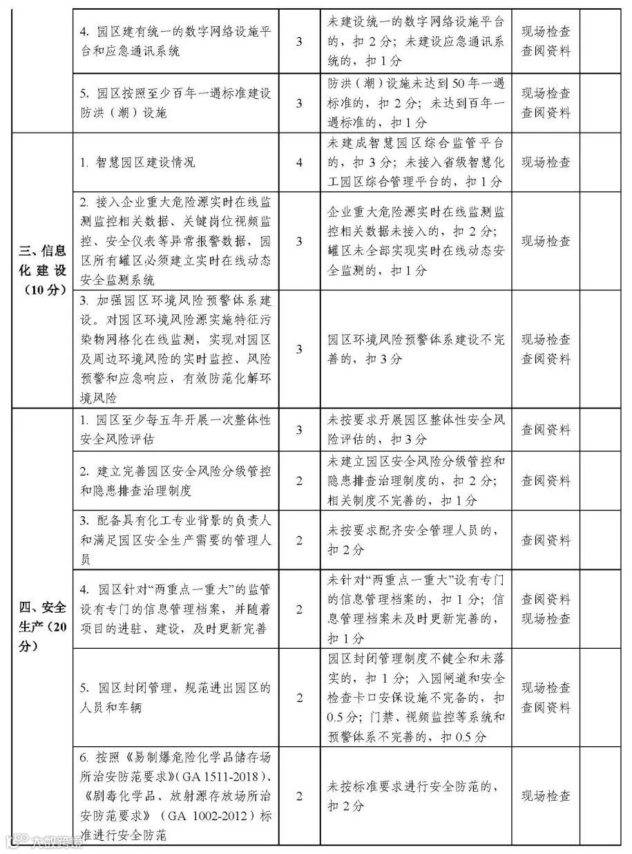 第七部分,管理监督。加强对园区运行情况的考核,实施动态管理,明确化工园区每三年考核一次,专业化工园区每两年考核一次。对考核不合格的给予警告,限期整改;对在规定时限内整改仍不合格的,取消园区资格。