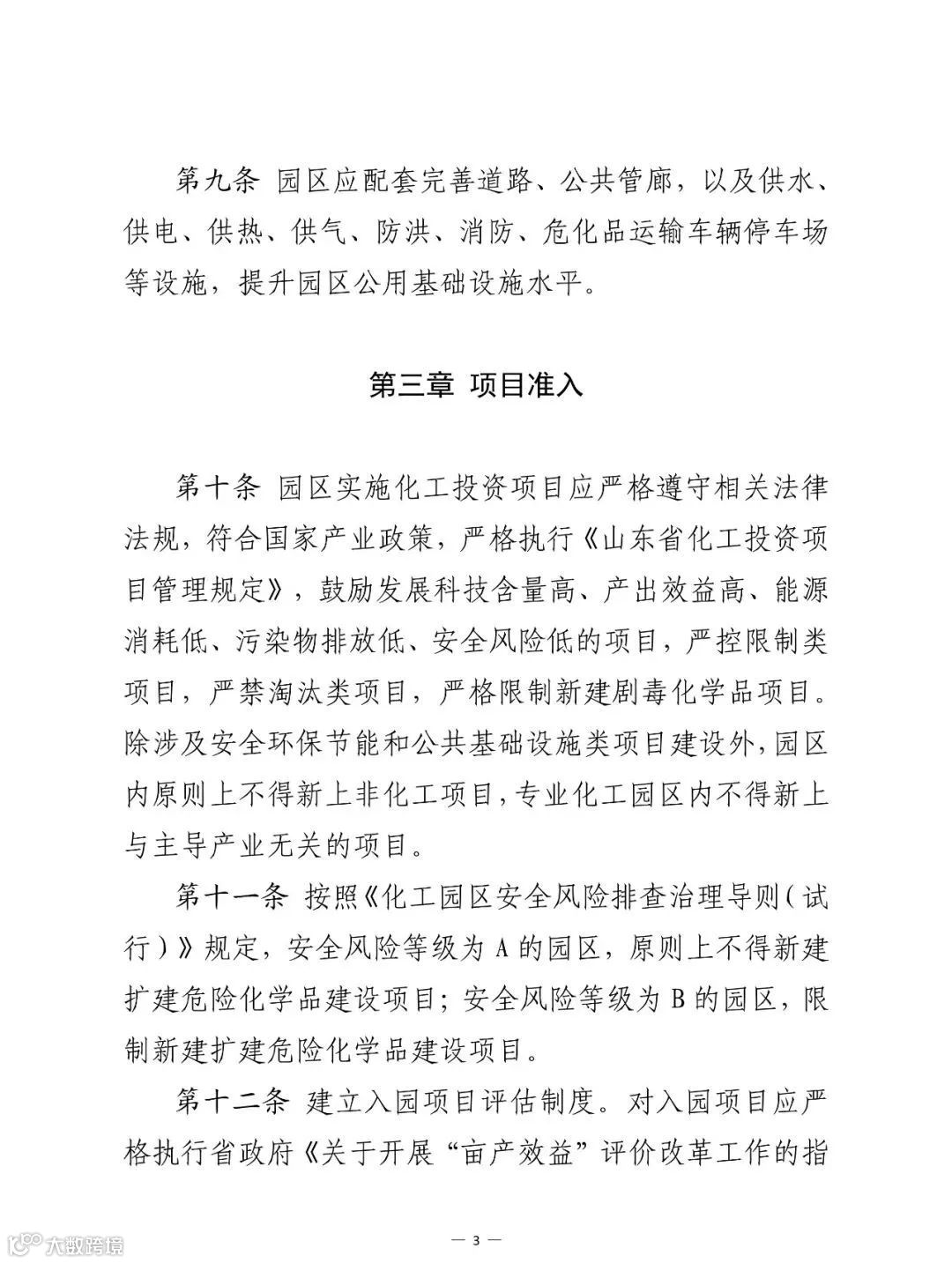 第三部分,项目准入。明确了入园项目准入原则,对新建扩建危险化学品建设项目设置了准入条件,对“亩产效益”达不到省政府文件要求的项目禁止入园。