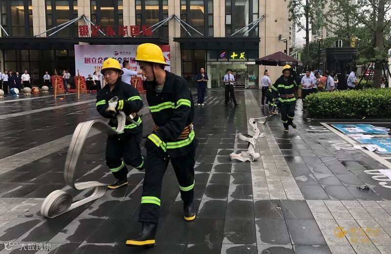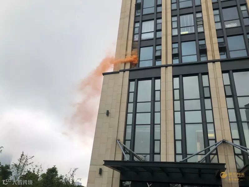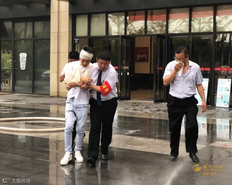刚结束电梯困人演习,随之而来的就是消防演习。场景设定为:银亿东岸国际A座一楼层突发火灾,若干人员被困,急需救援。