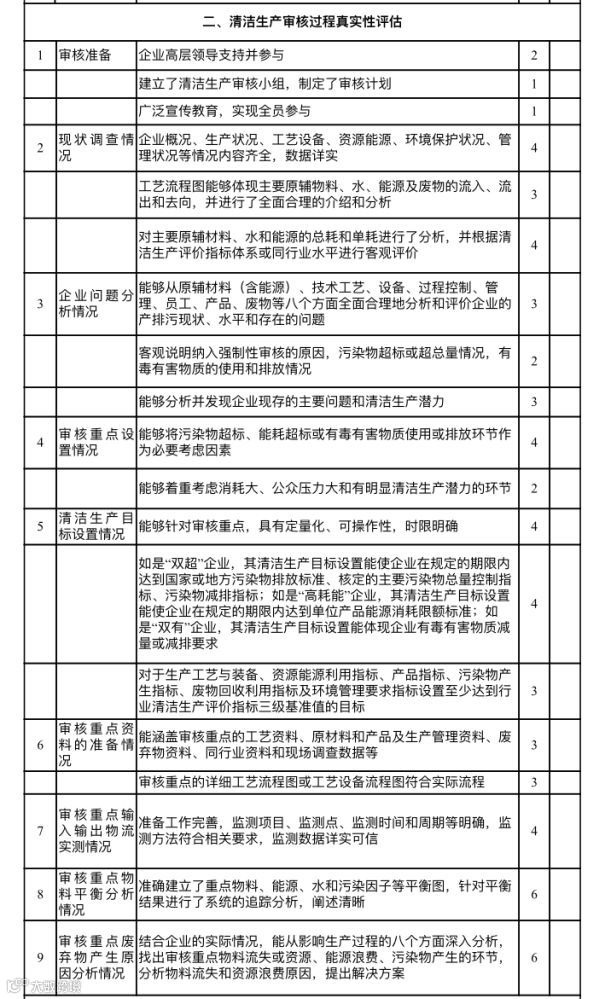 (二)对企业污染物产生水平、排放浓度和总量,能耗、物耗水平,有毒有害物质的使用和排放情况是否进行客观、科学的评价;清洁生产审核重点的选择是否反映了能源、资源消耗、废物产生和污染物排放方面存在的主要问题;清洁生产目标设置是否合理、科学、规范;企业清洁生产管理水平是否得到改善。