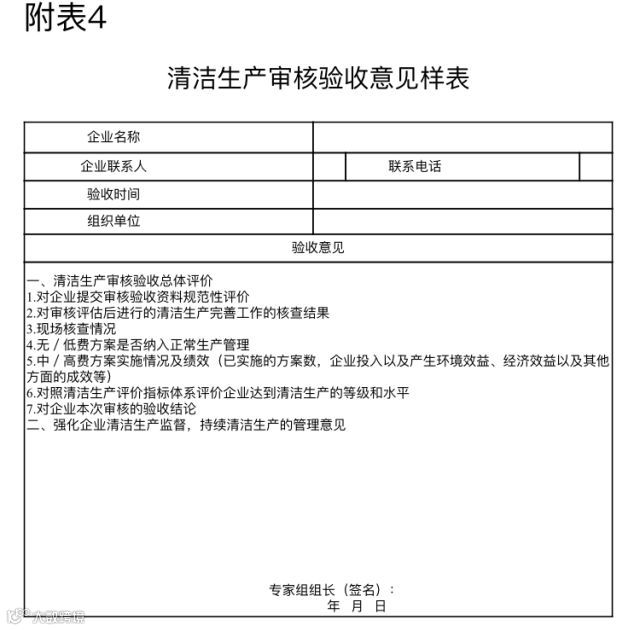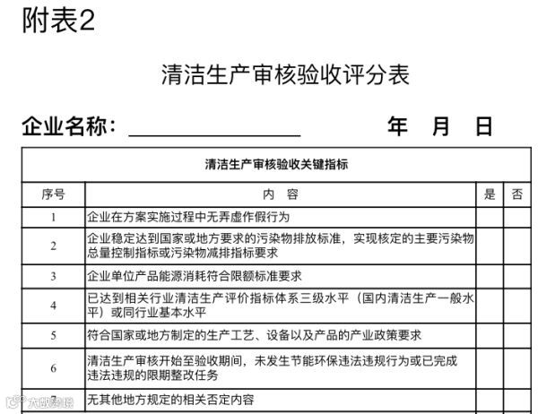 第十四条 《清洁生产审核验收报告》应由企业或委托咨询服务机构完成,其内容应当包括但不限于以下方面:(1)企业基本情况;(2)《清洁生产审核评估技术审查意见》的落实情况;(3)清洁生产中/高费方案完成情况及环境、经济效益汇总;(4)清洁生产目标实现情况及所达到的清洁生产水平;(5)持续开展清洁生产工作机制建设及运行情况。