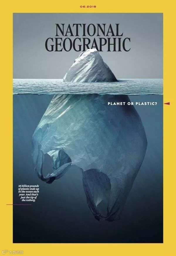 联合国环境规划署在每年的“6.5世界环境日”前都会根据当下的环境热点制定当年的环境日主题,而今年环境日的主题则直击我们人类在现在以及未来很长一段时间内都将面临的一大环境问题——塑料污染。2018年6月出版的《国家地理杂质》就以一幅极具象征意义的照片作为其封面,乍一看好似一座巨大的冰山漂浮在海中,而仔细一看便能发现,其在海平面以下的部分实为一只巨大的塑料袋,隐喻着我们的海洋正在遭受塑料污染的侵袭。这幅照片配以的标题也是极为简洁有力的三个单词——Planet or Plastic,可见塑料污染已然成为了危及我们这个星球可持续发展的重要问题。