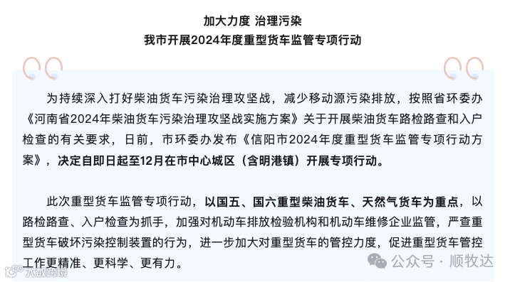 河南信阳将开展 2024 年度重型货车监管专项行动,此次行动以国五、国六重型柴油货车、天然气货车为重点。专项行动将重点检查重型柴油货车、燃气货车 ECU 系统标定参数刷改情况,污染控制装置完整性,包括是否存在温度传感器垫高、连接电线是否完整、尿素喷头是否拆除、尿素箱盖是否去除等;重型柴油货车私改天然气情况;重型燃气货车三元催化器装置完整性,查看是否存在后氮氧传感器使用屏蔽器等;重型柴油货车尾气排放检测以及车内尿素、油品质量情况。河南的卡友们要高度重视此次专项行动,提前对车辆进行自查自纠,确保车辆符合相关标准和要求,避免在检查中出现问题。