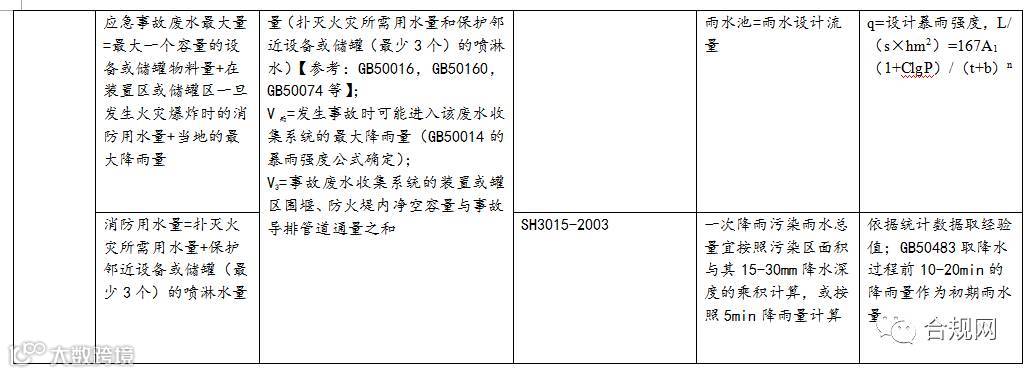注意,事故情况下进入事故池的雨水量与正常工况情况下的雨水也是不同的。一是降雨历时不同,正常生产运营过程中初期雨水是指刚下的雨水,一次降雨过程中的前10~20min最大降水量,其设计参数计算必须按GB50014规定的短历时暴雨强度公式确定;而事故时降水量应根据事故消防时间(参照GB50016、GB50160规定一般为2~6h,Q/SY 1190规定为6~10h)确定。二是汇水面积不同,初期雨水的汇水面积必须考虑生产区和储存区总的汇水面积;事故时只考虑装置区或罐区单独的能进入事故排水系统的最大降雨量,不作同时汇水考虑,且应采取措施尽量减少进入事故排水收集系统的雨水汇集面积。