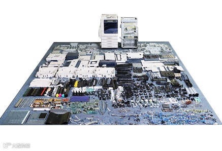 据统计,截止2015年我国打印机报废总量约为4392万台①。另外,打印机制造使用的材料十分广泛,包括各种金属材料和废金属材料,原件组成复杂。一台普通的数码多功能机内含有耗材和定期更换部件,可动部件以及高压高温,特殊功能部件等约6,300多种,17,300多个(见下图,下图为被拆解后的打印机零部件)。由此可见,每年将会有数以万亿件的打印机零部件报废。