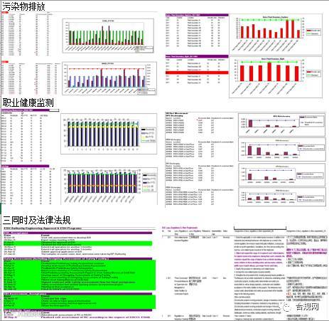 将这些图表浓缩加工后放在一张页面当中,最后的呈现如图。仪表板的内容因企业的不同而异,但都是在EHS运行的框架内关注核心绩效表现。