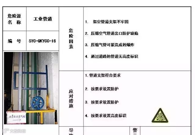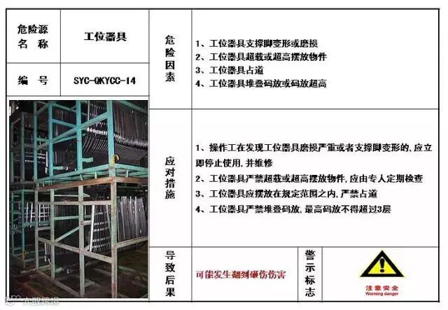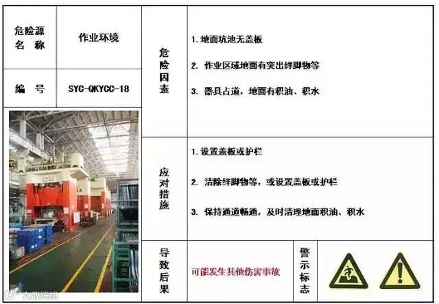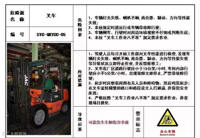 一份有关危险设备和危险作业目视化的资料:包括危险源名称、危险因素、应对措施、导致后果、警示标志......(点击图片放大更清晰) 1.起重作业 ![]()