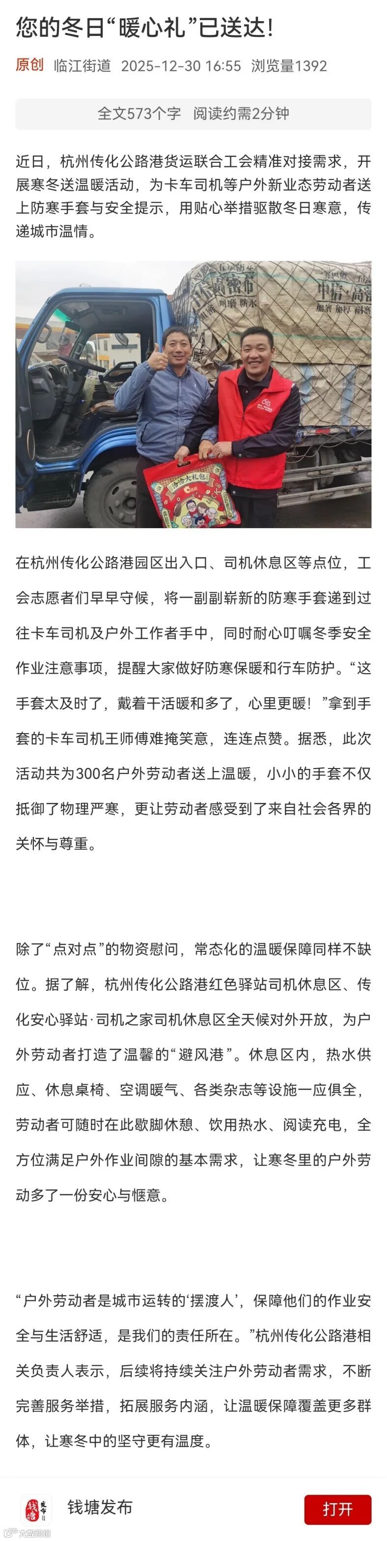 12月,杭州传化公路港货运联合工会面向园区卡车司机开展“冬季送温暖”活动,为300名卡车司机送上暖冬慰问礼包,在寒冬中传递工会对司机群体的真切关怀。本次活动受到社会关注,相关报道已刊发于“钱塘发布”。