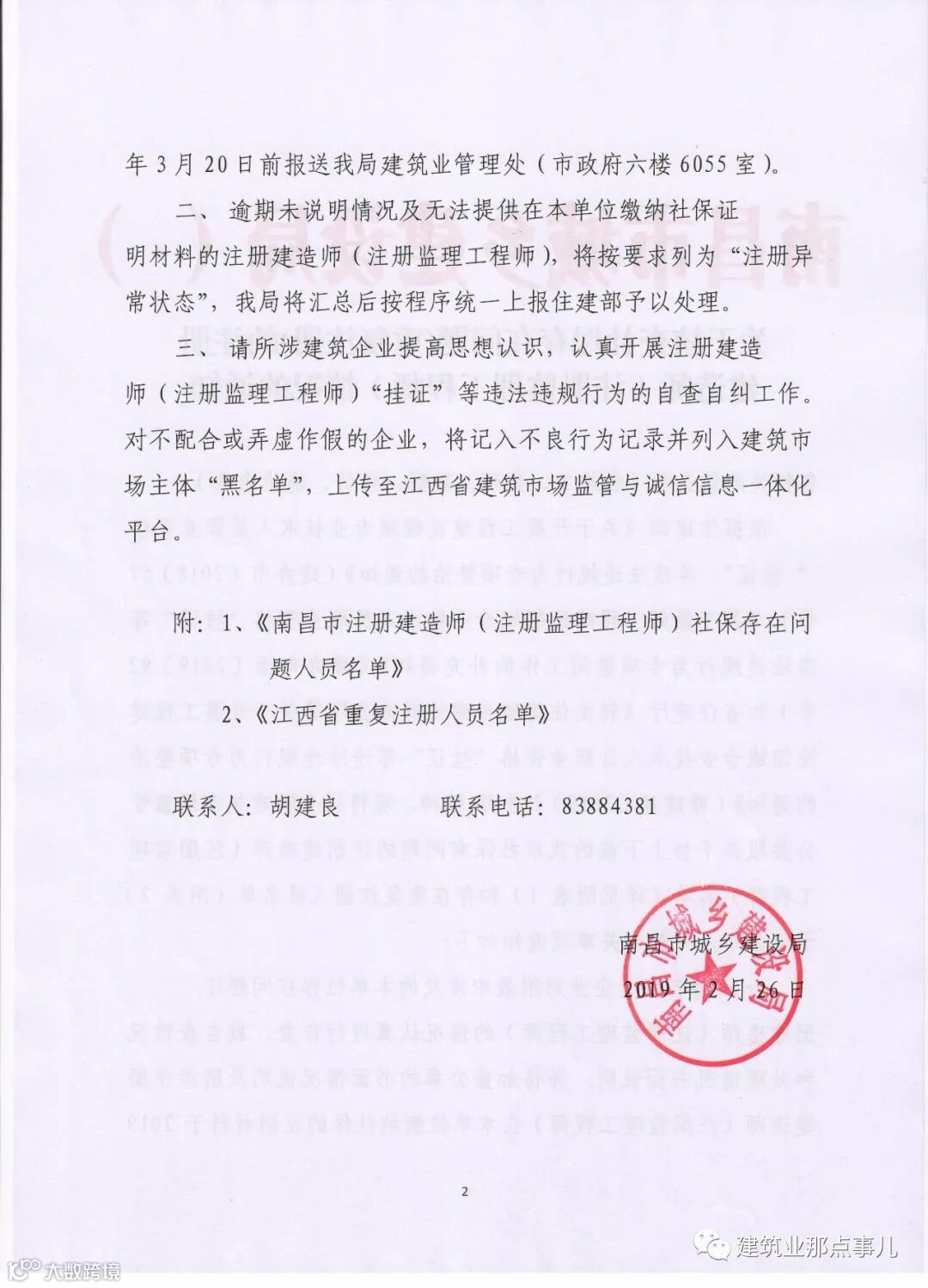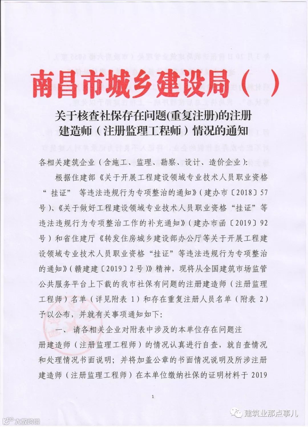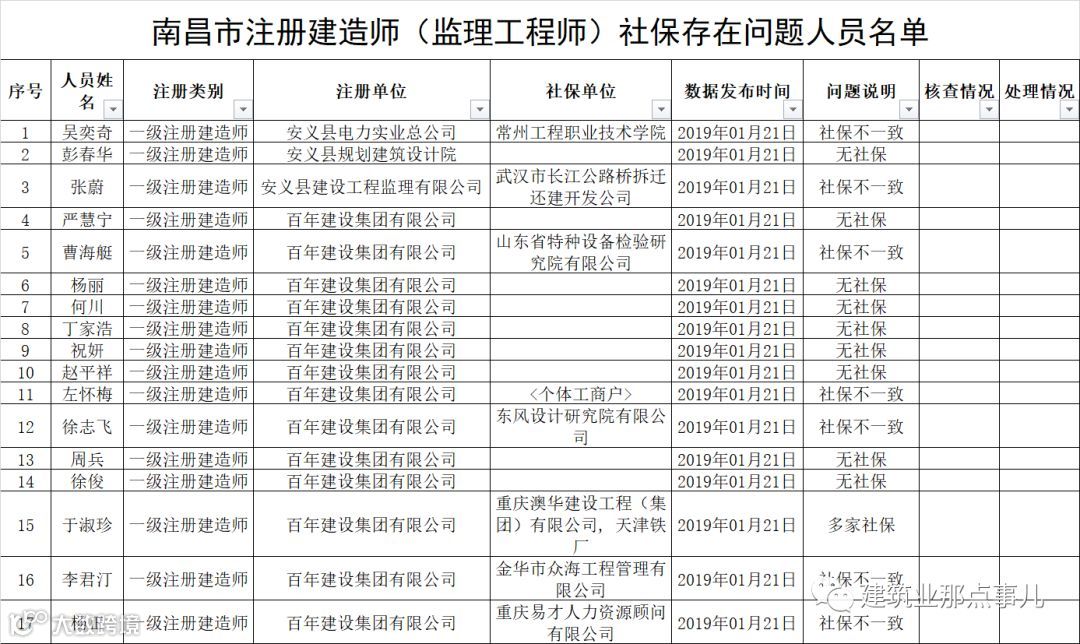 2019年2月26日南昌市住建局官网发布《关于核查社保存在问题(重复注册)的注册建造师(注册监理工程师)情况的通知》,该通知附件公布了《南昌市注册建造师(监理工程师)社保存在问题人员名单》