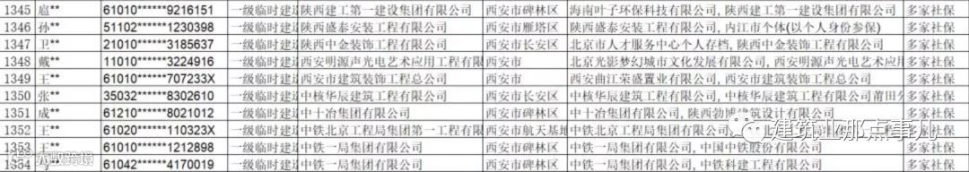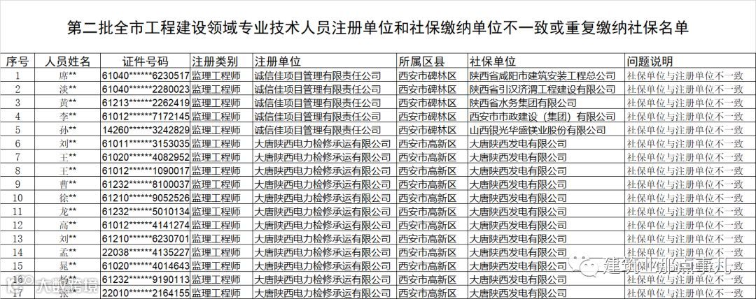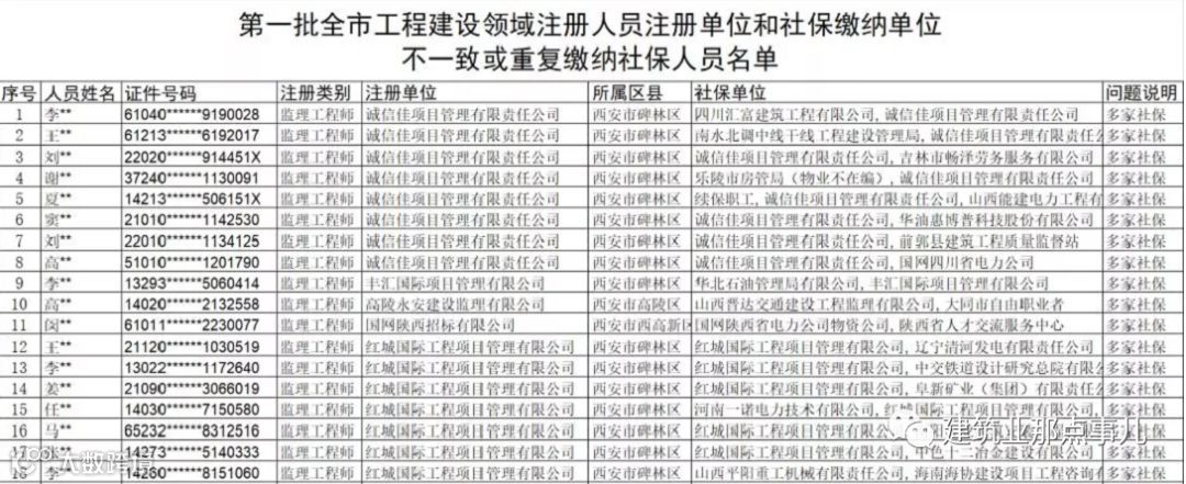 2019年2月02日西安市城乡建设委员会官网发布《第一批西安市工程建设领域注册人员注册单位和社保缴纳单位不一致或重复缴纳社保人员名单》,第一批共1354名人员。问题统一为:多家社保。