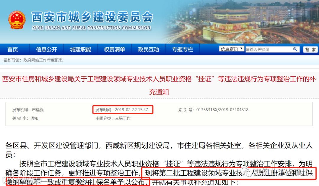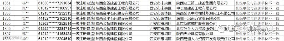 2019年2月22日西安市城乡建设委员会官网发布《第二批全市工程建设领域注册人员注册单位和社保缴纳单位不一致或重复缴纳社保人员名单》,第二批共1858名人员。问题为:社保单位与注册单位不一致;