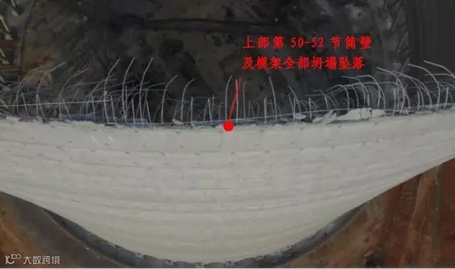 7时33分,7号冷却塔第50-52节筒壁混凝土从后期浇筑完成部位(西偏南15°-16°,距平桥前桥端部偏南弧线距离约28米处)开始坍塌,沿圆周方向向两侧连续倾塌坠落,施工平台及平桥上的作业人员随同筒壁混凝土及模架体系一起坠落,在筒壁坍塌过程中,平桥晃动、倾斜后整体向东倒塌,事故持续时间24秒(部分事故现场如图4、图5、图6所示)。