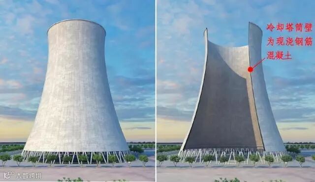 2.7号冷却塔工程概况。事发7号冷却塔属于江西丰城发电厂三期扩建工程D标段,是三期扩建工程中两座逆流式双曲线自然通风冷却塔(如图1所示)其中一座,采用钢筋混凝土结构。两座冷却塔布置在主厂房北侧,整体呈东西向布置,塔中心间距197.1米。7号冷却塔位于东侧,设计塔高165米,塔底直径132.5米,喉部高度132米,喉部直径75.19米,筒壁厚度0.23至1.1米。