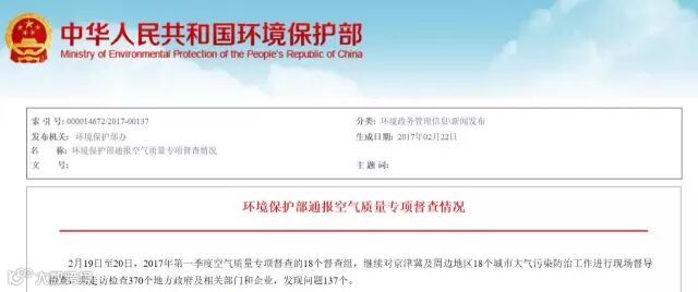 为落实京津冀及周边地区大气污染防治协作小组第八次会议要求,推动地方党委政府落实大气污染防治责任,环境保护部联合北京、天津、河北、河南、山东、山西6省(市),于2月15日~3月15日开展2017年第一季度空气质量专项督查。此次专项督查的主要目的是推动地方党委政府进一步落实大气污染防治责任,应对京津冀及周边地区重点城市采暖期重污染天气频发问题,为《大气十条》第一阶段目标奠定基础。