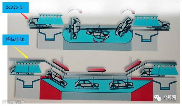(3)在车身与阳极间无吊架干扰,极距可缩短0.15~0.20m,有利于电泳涂膜均匀和泳透力的提高。因此,可节约电泳液的用量,VOCs的产生量相应的也减少了。