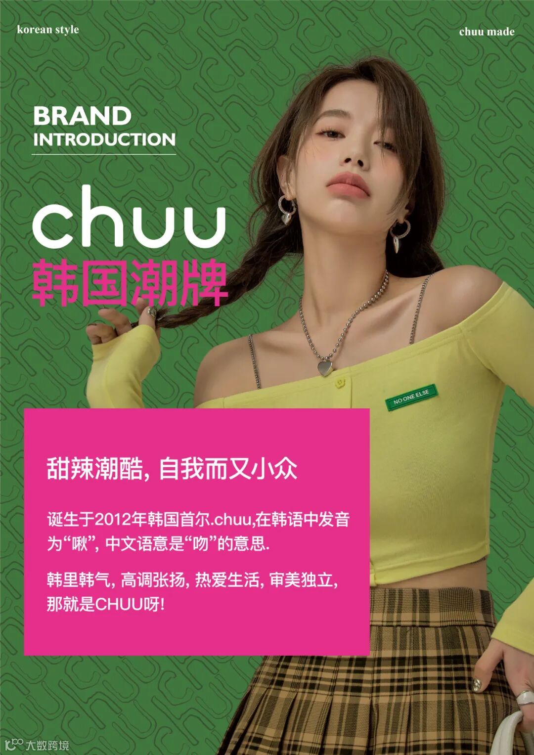 chuu,韩国本土网红潮流时尚品牌。2012年创立于韩国首尔。甜辣,轻运动,高调张扬的自我穿搭方式。
