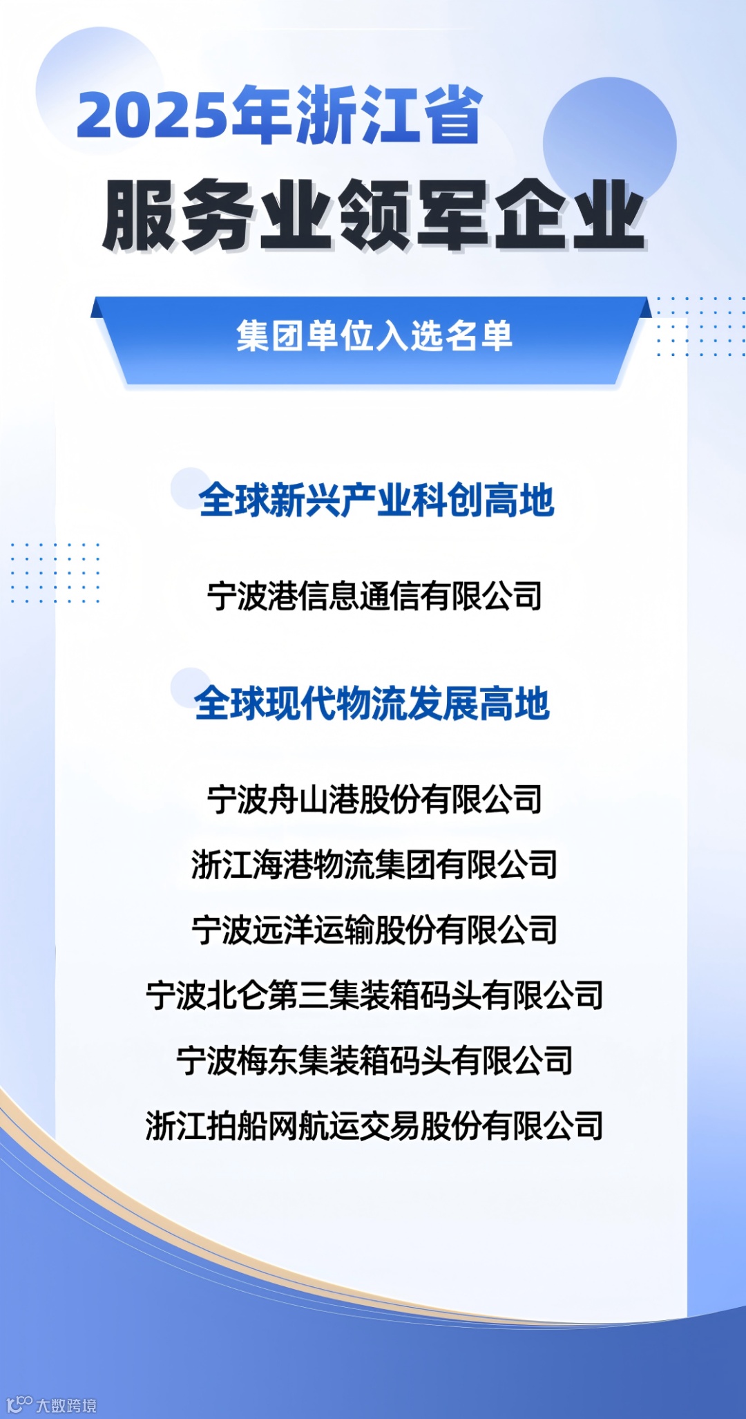 日前,2025年浙江省服务业领军企业名单正式公布,浙江省海港集团、宁波舟山港集团系统7家单位凭借突出的综合实力与扎实的专业底蕴成功入选,跻身全省服务业高质量发展标杆行列。