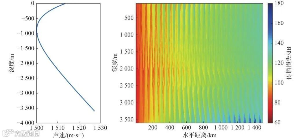 图9 使用Munk声速剖面及传播损失随距离深度变化图
