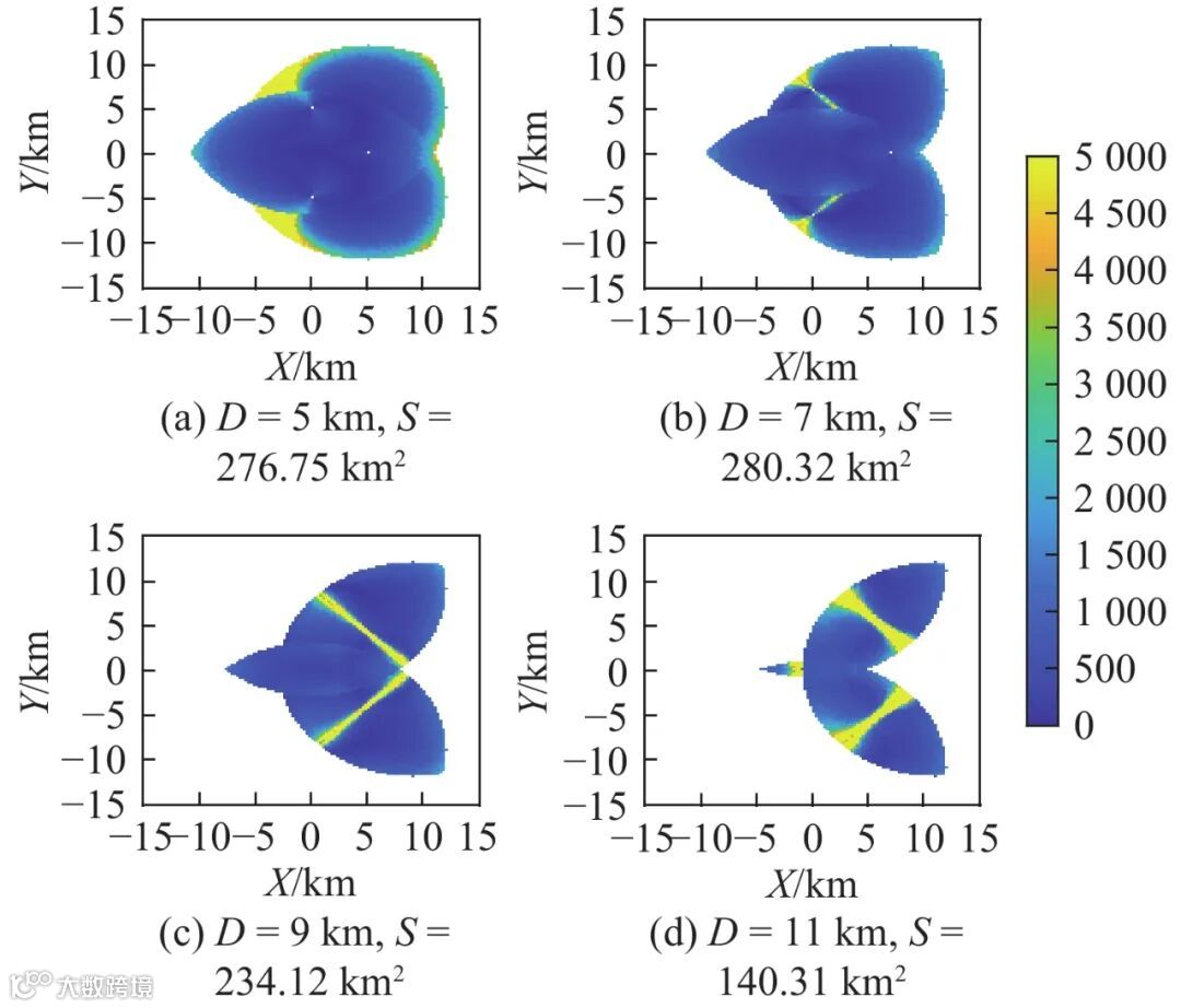 被动分布式探测系统由多个位于不同位置的子阵列组成,通过数据级或者结果级的联合处理获得目标的水平位置估计。数据级处理场景要求多子阵信息互联,可传输各子阵阵元域数据或中间结果(如协方差矩阵),再进行阵元域或中间结果的联合处理,该处理场景对系统通信能力有较高要求。对于弱联通场景,被动分布式探测的核心是低通信需求与本地高效处理融合。可在数据融合中心采用鲁棒算法适应时延与带宽限制,在网络层面优化拓扑与资源分配,提升系统整体工作性能[44-45];在本地节点通常使用间接定位方法实现结果级目标定位,具有计算简单,便于实现的优势,能够很好适用于多基地非同步弱联通条件下的被动定位场景。分布式阵列的探测区域覆盖和定位精度是评价多基地被动探测系统的重要指标。对于间接定位方法,其探测区域覆盖和定位精度严重依赖于各子阵探测距离和测向精度。假设3个子阵组成的分布式被动探测系统,系统按照等边三角形布置3个子阵位置,得到的分布式被动探测覆盖和定位精度如图4所示,其中子阵之间的直线距离记为D(km),探测区域面积记为S(km2)。分布式探测性能评估图为东西(X轴)和南北(Y轴)二维分布彩图,色值表示间接定位误差,图中给出的探测面积覆盖是指定位误差小于1 km的覆盖面积,可以看出定位盲区主要位于子阵连线区域,三角形子阵布局盲区较小。