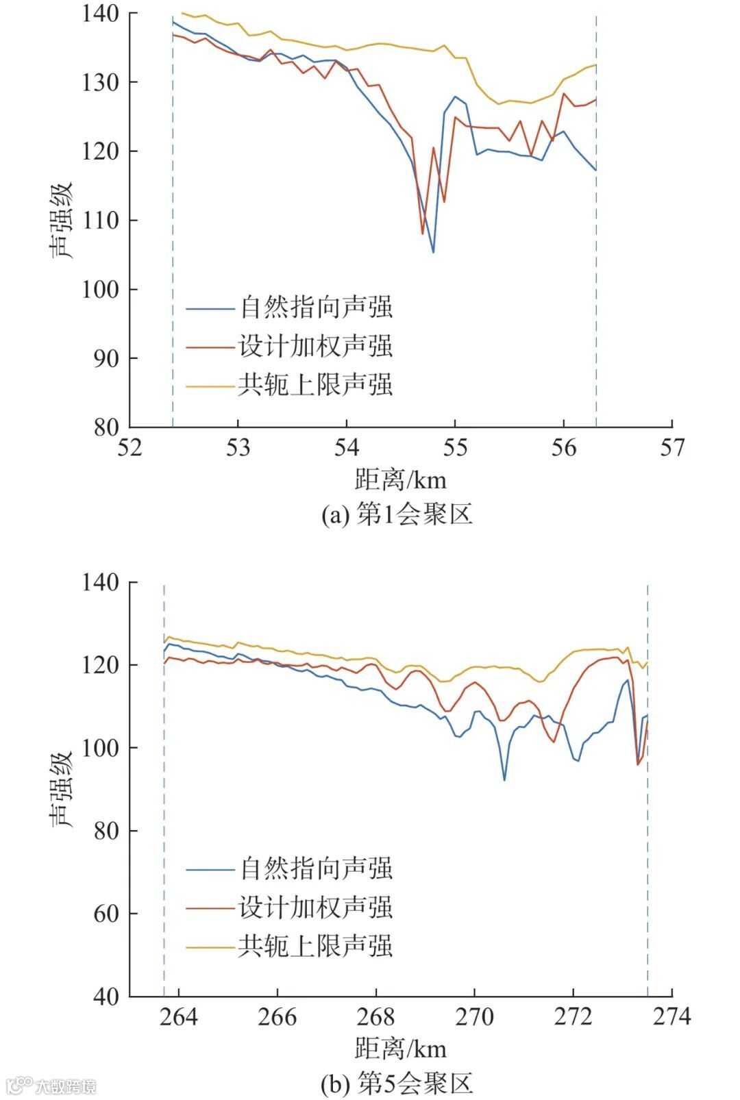 图8 垂直阵发射深度150 m某典型深海声速剖面的第1和第5会聚区声强分布情况[51]