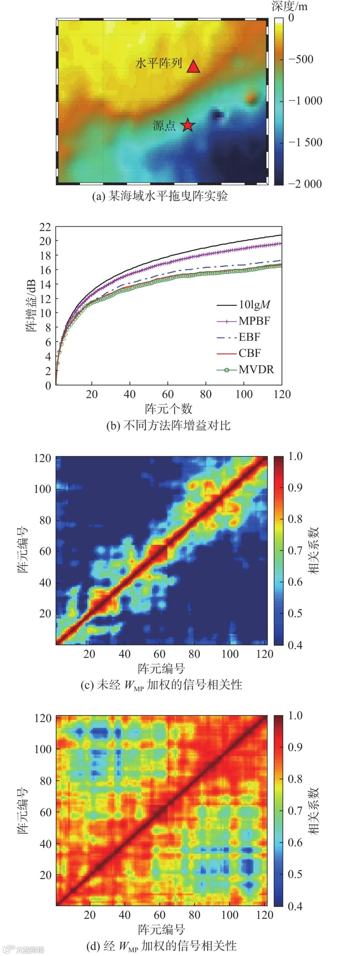 海洋环境(海水声速剖面、海底地形和海底地质等)和声源参数(声源深度和频率等)的变化会对水声信道产生较大影响,致使其物理性质具有很强的复杂性和不均匀性,也将影响阵列波束输出增益[33]。为了克服复杂水声信道对波束输出增益的影响,谢磊提出了相位匹配波束形成器(matched phase beamformer,MPBF)[34]。MPBF能够对水声信道的相位起伏进行补偿,改善阵元接收信号之间的相关性,获得较高的阵增益。利用在某海域开展的192元水平拖曳阵实验数据,对比分析常规波束形成器(conventional beamformer,CBF)、最小方差无失真响应(minimum variance distortionless response,MVDR)波束形成器和特征波束形成器(eigenvalue beamformer,EBF)等典型波束形成器以及MPBF的阵增益,验证MPBF在复杂波导环境中可获得较高的阵增益(图2)。