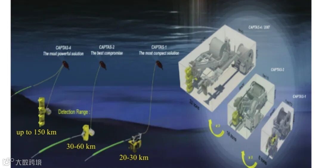 “安静型”水下目标辐射噪声已降至海洋环境噪声水平,传统被动声呐对其探测的距离急剧下降,难以满足日益激烈的水下探测形势需要。美俄实践经验表明,主动声呐探测成为可选的方案之一,图5给出了主动声呐发射信号频率、声源级和探测距离的关系示意图[46]。美国海军自20世纪60年代以来先后研制了AN/SQA-10,AN/SQS-35,AN/SQA-13,SQR-20,SQQ-90等多型可变深主动探测声呐,并大量装备大中型水面舰艇(图6)[47]。法国泰勒斯(Thales)公司生产的综合拖曳声呐(CAPTAS)装备的国家最广,包括CAPTAS-4,CAPTAS-2和CAPTAS-1等型号[48],如图7所示,其探测范围最大可达150 km。在主动探测体制中,主动多基地探测能够很好地降低或规避混响带来的困扰,逐渐成为探测水下“安静型”目标的有力手段。但是受到海洋波导环境影响,目前主动探测声呐在使用时仍面临发射声能量不聚焦及多节点布放位置待优化等问题。