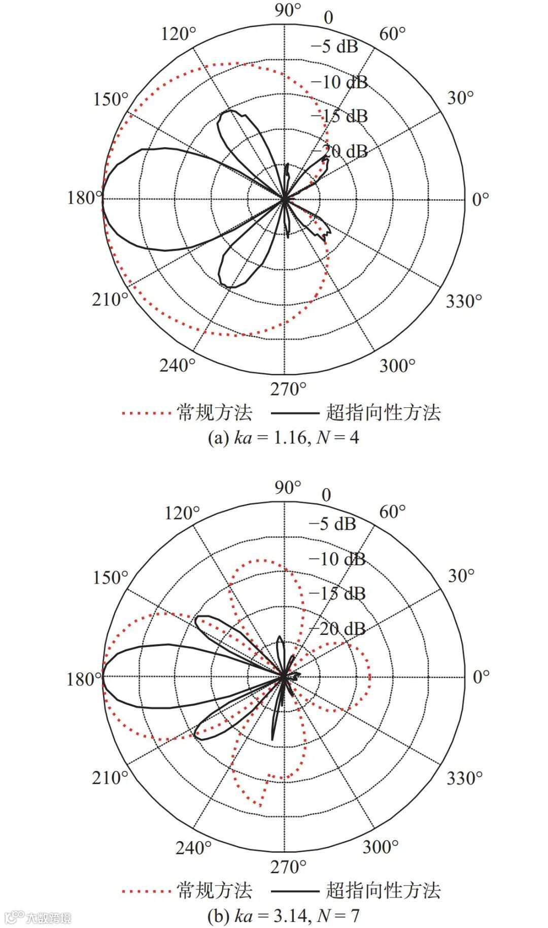 随着声呐探测频段逐渐向低频转移,被动声呐面临的核心问题是有限孔径阵列在低频段输出增益降低。通过波束优化设计实现波束图控制,可获取较高的波束输出增益。早在1946年Uzkov首先发现了M2定律[30],阵列的最大方向性指数在阵元间距与波长比值无限小时可达20lgM dB(M为阵元个数)。在此基础上,Ma等[31]提出一种特征波束分解与综合模型,能够提供超指向性的精确闭式解,且过程简单易实现。该模型直接从超指向性最优解出发,利用空间均匀噪声场中圆环阵噪声互谱矩阵是循环矩阵的特性,将最优波束图和最大指向性因子分别表示成有限阶子分量的叠加和形式,且该过程不受空间采样限制,所得的结果没有理论误差。使用16个无指向性声压水听器组成圆环阵进行水池试验,圆环阵半径为0.25 m。图1给出了不同ka(波数半径乘积)和超指向性阶数条件下的超指向性方法和常规波束形成方法的波束图。由图1可见,超指向性方法的波束主瓣宽度明显减小,阵列增益显著增加。杨益新等[32]进一步发展了传感器阵列超指向性理论,并应用到实际声呐系统,提升了声呐阵列处理增益。