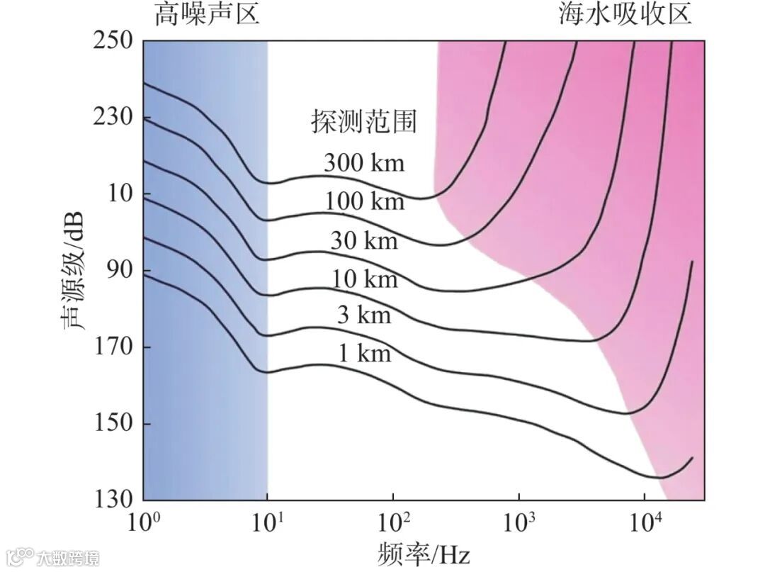 图5 主动声呐探测发射信号频率、声源级和探测范围示意图[46]