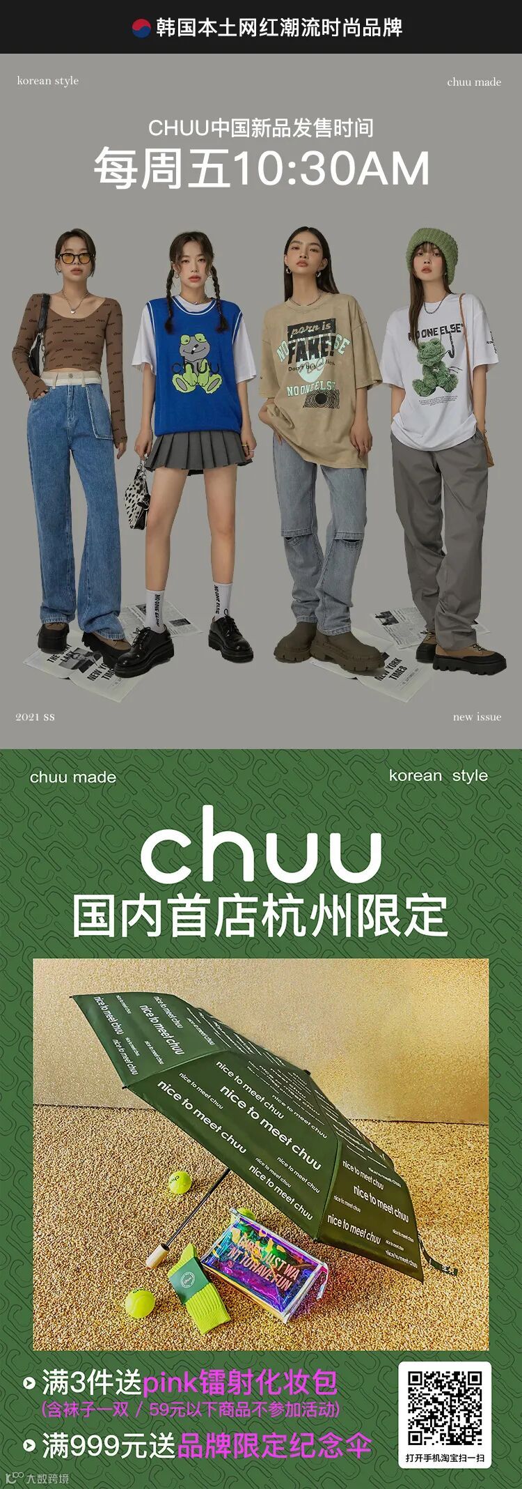 chuu,韩国本土网红潮流时尚品牌。2012年创立于韩国首尔。甜辣,轻运动,高调张扬的自我穿搭方式。
