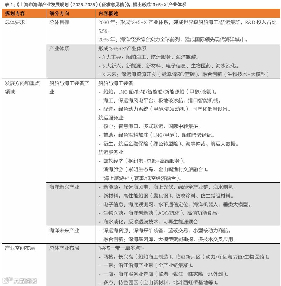 海洋经济政策正呈现 "高端化、智能化、绿色化"协同发展态势,通过构建多层级产业体系、强化科技创新与区域联动,加速向深远海和战略性新兴产业拓展。2025年6月,上海市发布《上海市海洋产业发展规划(2025-2035)(征求意见稿)》,提出形成"3+5+X"产业体系。2025年2月广东省发布《广东省促进海洋经济高质量发展条例(草案修改稿征求意见稿)》,提出重点支持八大海洋新兴产业集群。