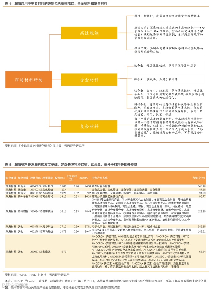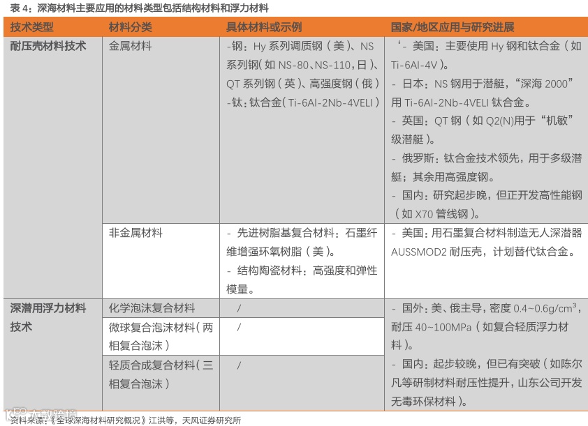 深海材料是深海科技发展基础,主要包括结构材料和浮力材料。据估计,海洋蕴藏了超过全球70%的油气资源,开发和利用这些资源需要解决由于水深造成的低温、高压、环境恶劣、作业条件复杂的一系列开发技术问题。在深海油气资源的开发过程中,深海材料的研究和应用占有重要地位,海洋材料是深海科技的基础。深海中主要应用的材料类型分为两类,一种是制造耐压壳使用的结构材料,另外一种是制造深潜器所用的浮力材料。深海应用中主要材料的研制包括高性能钢、合金材料和复合材料。建议关注特种钢材、钛合金、高分子材料等相关领域。