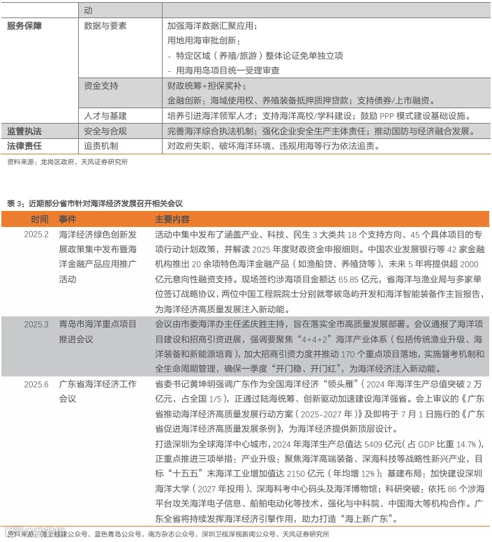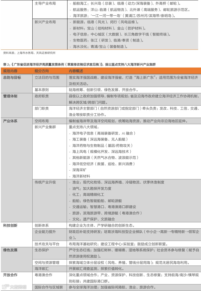 海洋经济政策正呈现 "高端化、智能化、绿色化"协同发展态势,通过构建多层级产业体 系、强化科技创新与区域联动,加速向深远海和战略性新兴产业拓展。2025年6月,上 海市发布《上海市海洋产业发展规划(2025-2035)(征求意见稿)》,提出形成"3+5+X"产 业体系。2025年2月广东省发布《广东省促进海洋经济高质量发展条例(草案修改稿征求 意见稿)》,提出重点支持八大海洋新兴产业集群。此外福建2025年2月13日举办“海洋 经济绿色创新发展政策集中发布暨海洋金融产品应用推广活动”,一次性发布海洋科技创 新能力提升、海洋领域新技术新产品新场景应用推广、水产种业振兴、深远海养殖高质量 发展、水产品加工高质量发展、“美丽渔村”建设等多个专项行动计划。山东青岛: 2025 年3月20日,青岛市海洋发展局召开全市海洋重点项目推进会议,出要改造提升现代渔 业等传统优势产业,培育壮大海洋装备、海洋新能源等海洋新兴产业,强力推进深海开发 等海洋未来产业。广东省2025年6月26日,全省海洋经济工作会议召开,为海洋经济提 供新顶层设计。