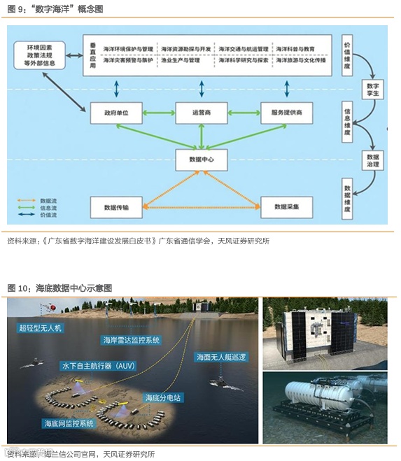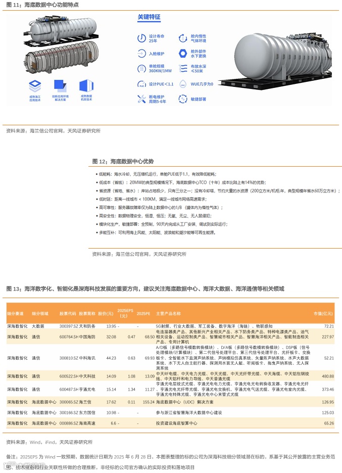 海洋数字化、智能化是深海科技发展的重要方向。海洋电子信息产业加速向网络化与智能化方向转型升级。在装备技术方面,海洋观测装备已实现快速、低成本、差异化的组网运行,逐步由“平台为中心”向“网络为中心”转变,并向通用化、模块化深入发展。在信息传输领域,5G通信、量子通信、中微子通信等新型通信技术加快应用,推动海洋信息传输向宽覆盖、跨介质、网络化、全天候及实时方向发展。与此同时,垂类大模型发展势头迅猛,PortGPT1.0、ShippingGPT等专业模型相继推出,DeepSeek大模型在多个港口实现规模化部署,带动港航全产业链智能化转型,为海洋电子信息产业发展注入新动能。海底数据中心是海洋数字化发展的关键基础设施。“数字海洋”是指以新一代信息技术为支撑,以海洋数字孪生为要件,以全要素数字化为特征,以海洋决策科学化、治理精准化、服务高效化、生产智能化、运行协同化为目的,是构建现代海洋产业体系、提升海洋科技创新能力的重要基础,是推进海洋治理体系和治理能力现代化水平的重要引擎。数据中心是“数字海洋”中关键的一环,而海底数据中心有着诸多优势。海底数据中心由岸站、海底光电复合缆、海底分电站及海底数据舱组成。海底数据中心主体结构为罐体结构,电气设备、冷却系统均布置在罐体内部,罐体顶部为海水冷却系统,海底中心有诸多优势。建议关注海底数据中心、海洋大数据、海洋通信等相关领域。