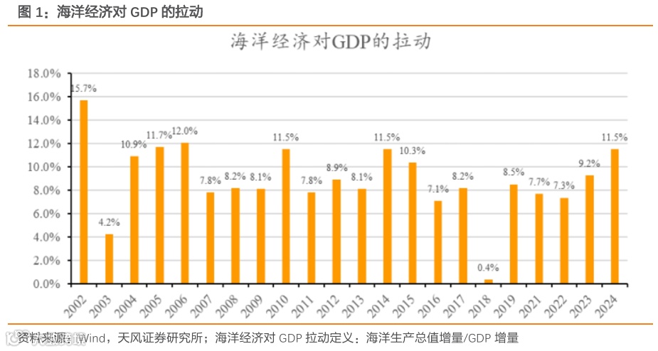海洋经济有效拉动 GDP 增长,产业空间具备规模。根据《2024 年中国海洋经济统计公报》,2024 年全国海洋生产总值首次突破 10 万亿元,占 2024 年国内生产总值 7.8%,产业规模上,海洋经济具备广阔的空间,是驱动经济增长的重要模块。海洋经济对 GDP 的拉动作用达 11.5%,已成为驱动经济增长的新引擎。